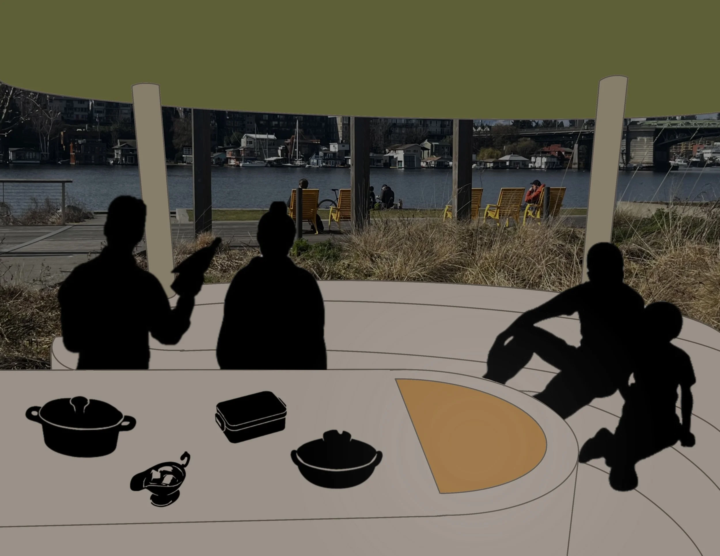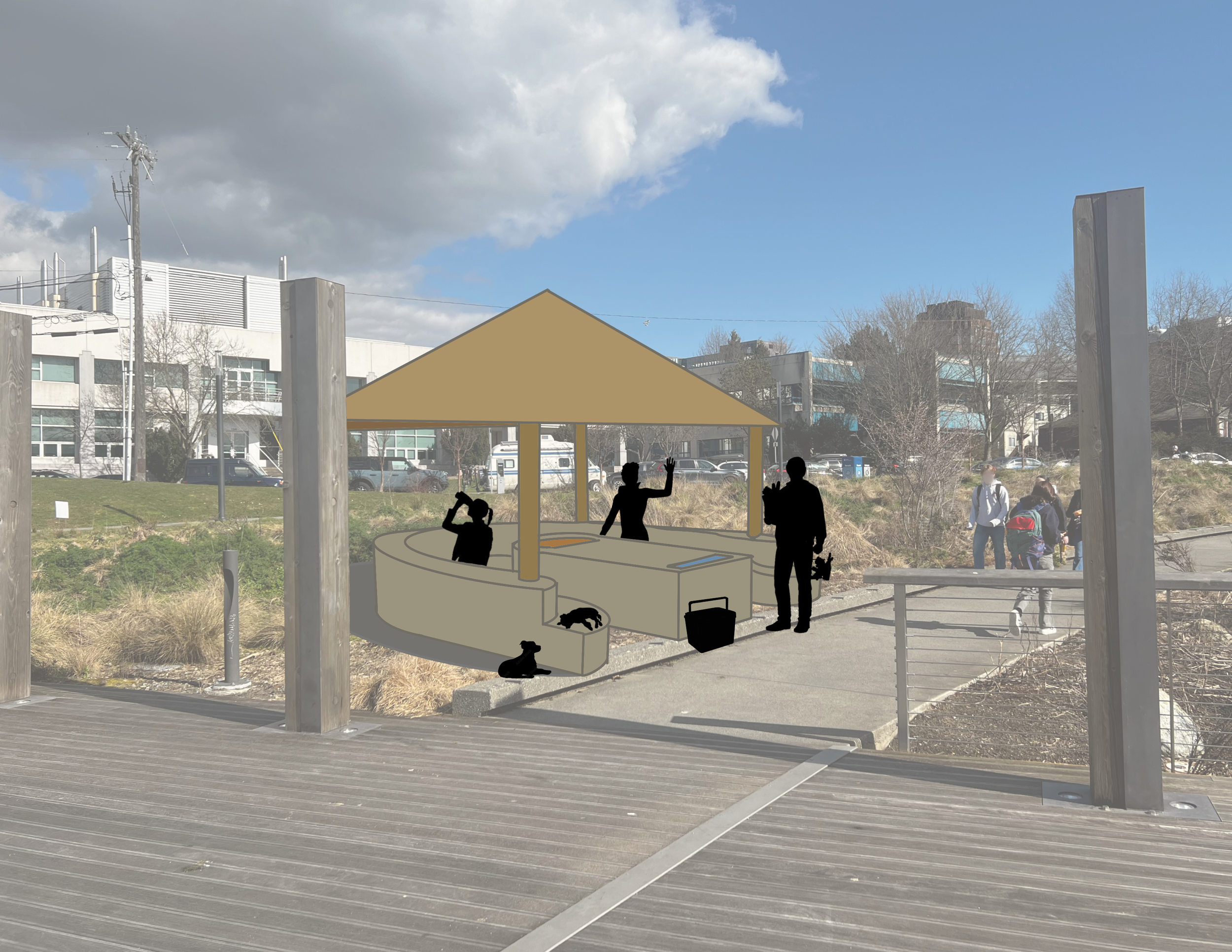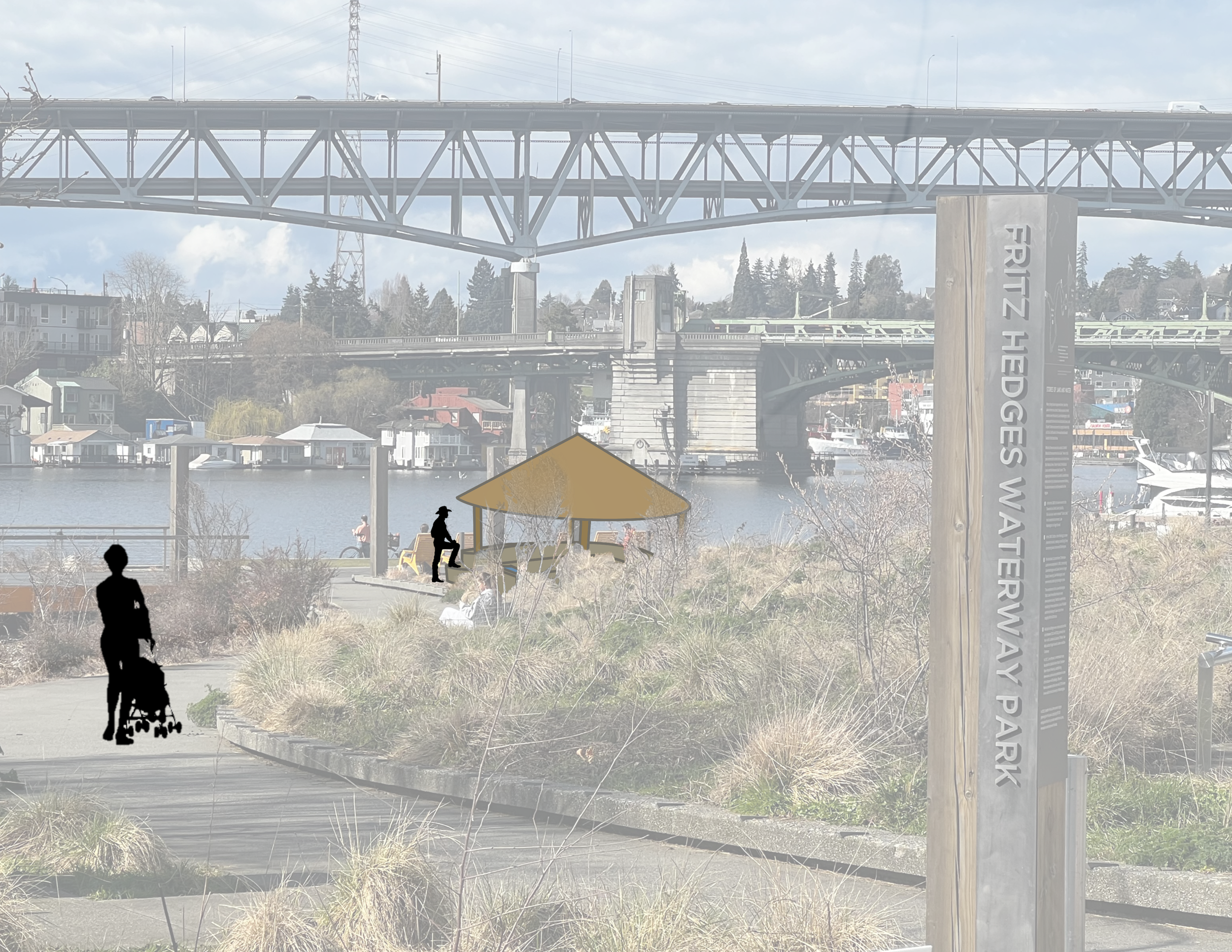Fritz Hedges is a south facing waterfront park located in Portage Bay, just south of the University of Washington campus in Seattle, established in 2020. A key observation I made was the lack of a covered space to gather.