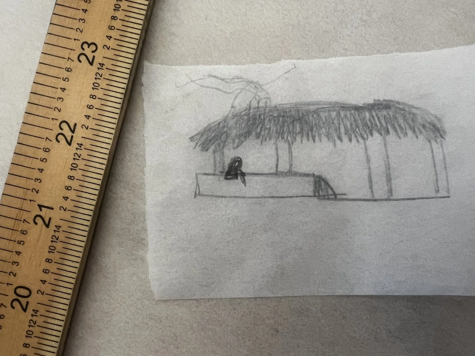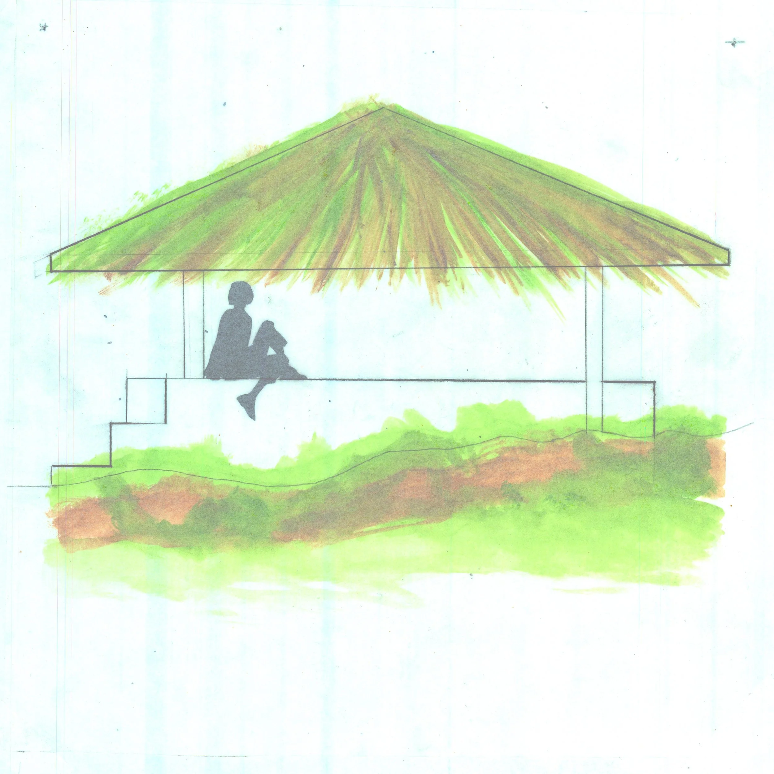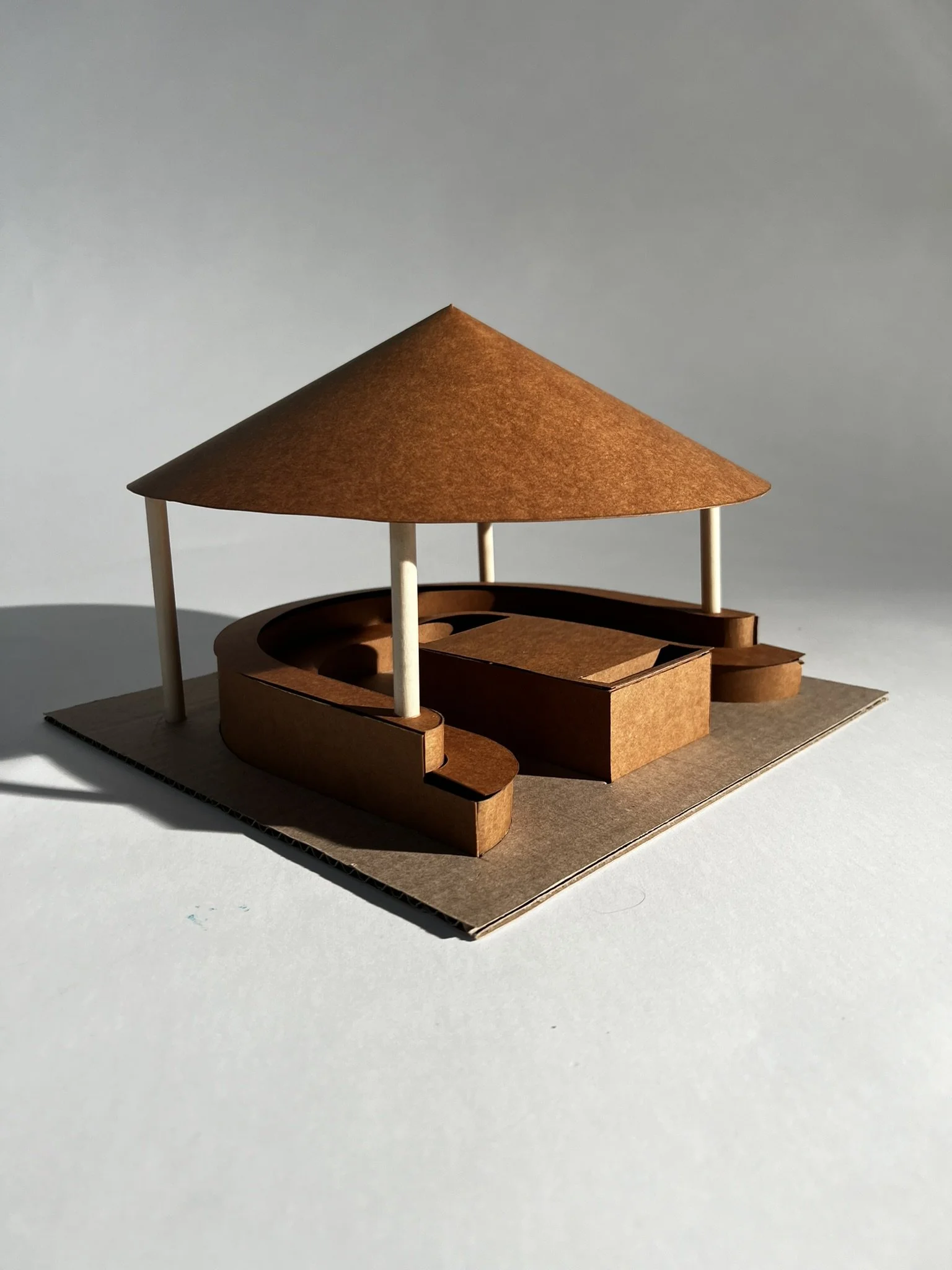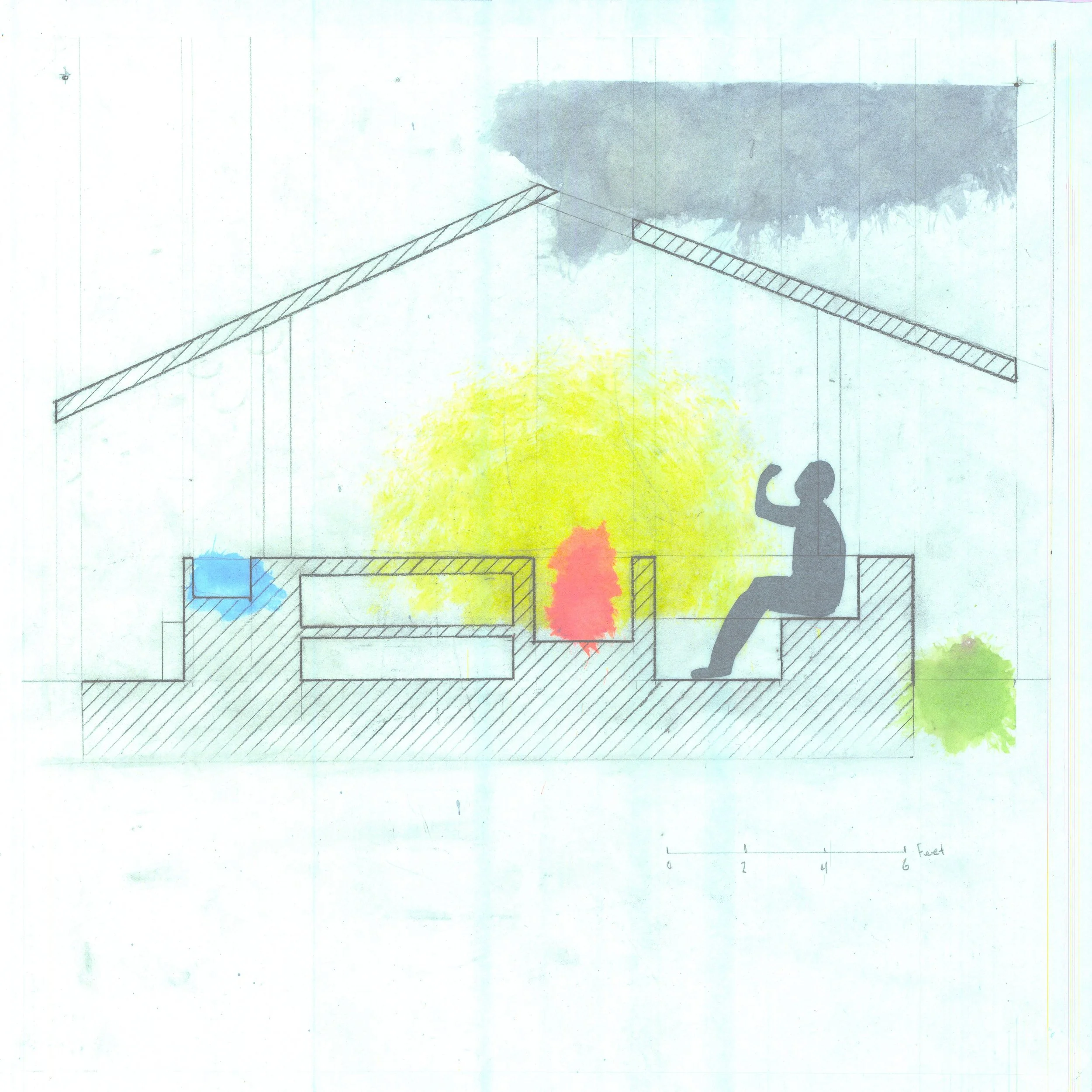 I designed a structure around a firepit, countertop. and water basin. The idea of a kitchen intruding on a living room, to create a space of experience around food, is fun! A key element to fun is togetherness, and food is common strand that unites people.