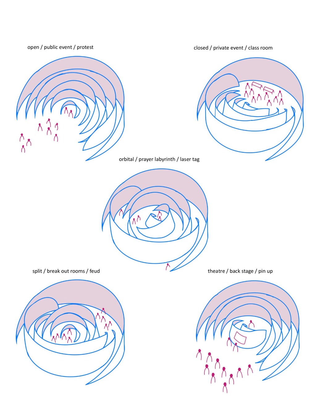 The true beauty of this project comes through when the intended space to be used for 2-3 people at a time, can be also utilized at times to host large groups for different uses. A maze for two can open to a theatre stage.